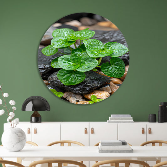 Jonge groene plant tussen stenen aluminium muurcirkel