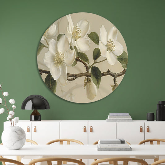 Witte bloemen op tak tegen beige achtergrond forex muurcirkel