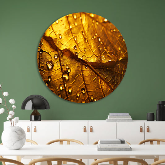 Waterdruppels op goudkleurig blad in detail forex muurcirkel