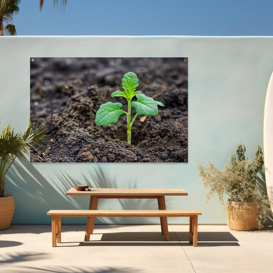 Jonge groene plant in vruchtbare aarde tuinposter