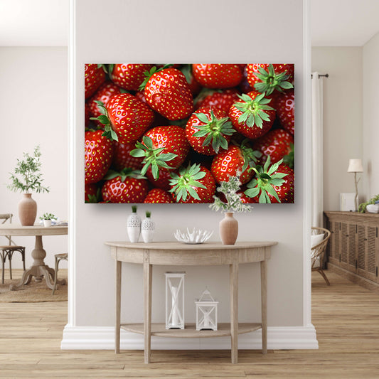 Rijpe rode aardbei met frisgroene bladeren canvas met baklijst