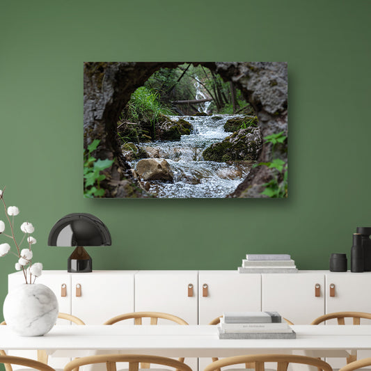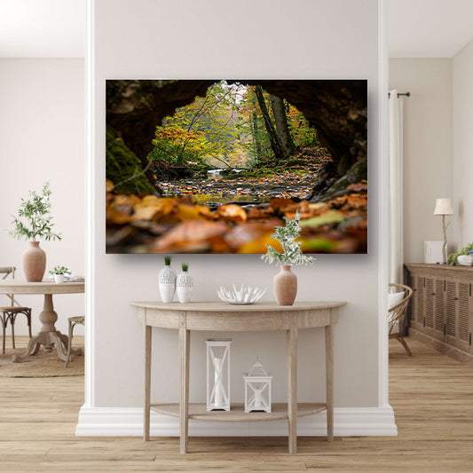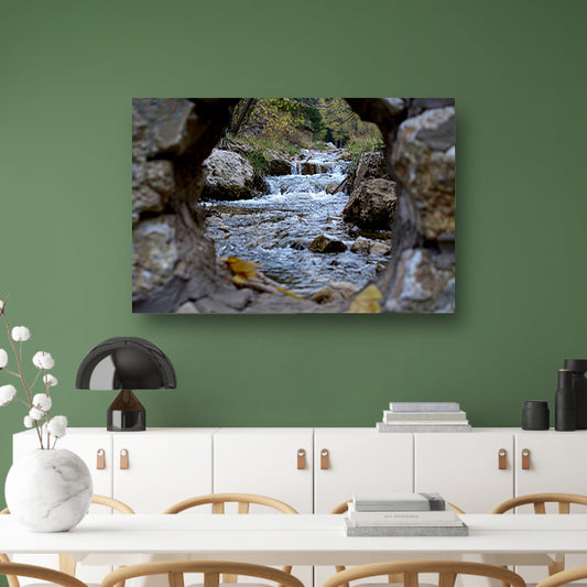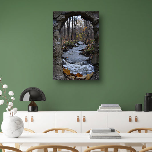 Rivier stroomt door stenen raam in herfstbos acrylglas