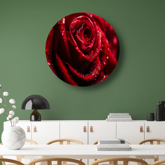 Rode roos met dauwdruppels close-up aluminium muurcirkel