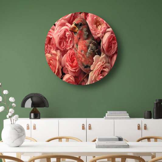 Vogel omhuld door roze rozenpracht aluminium muurcirkel