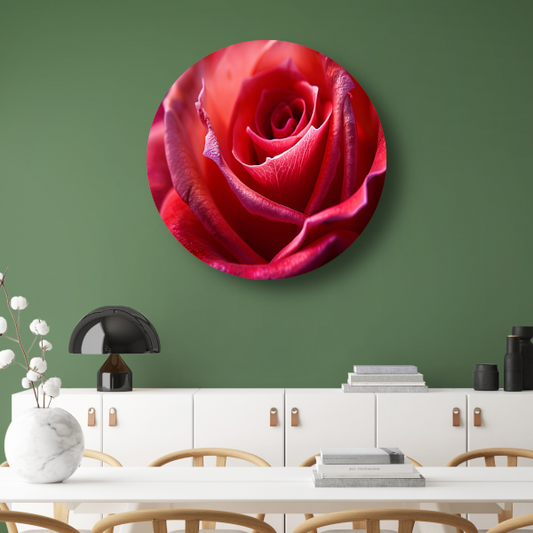 Elegante rode roos in volle bloei close-up aluminium muurcirkel