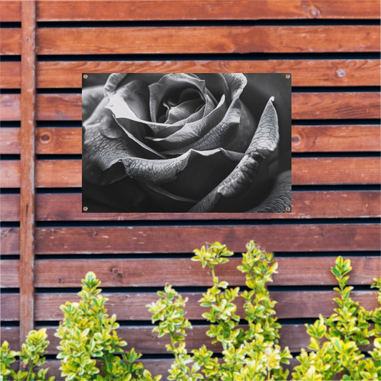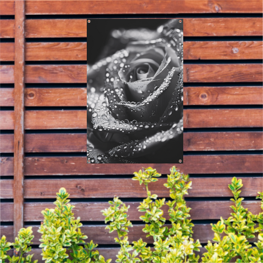 Elegante zwart-witte roos met gedetailleerde druppels tuinposter