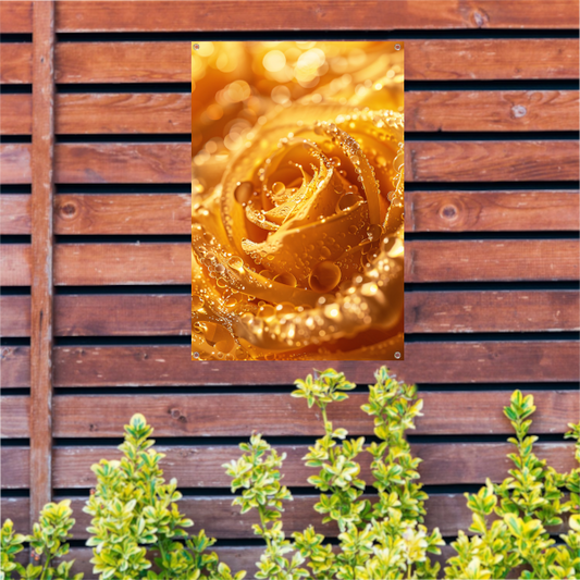 Gouden roos met waterdruppels op delicate bloemblaadjes tuinposter