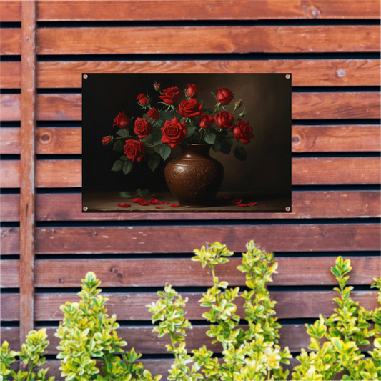 Stille Elegance: Rode Rozen in Sierlijke Vaas tuinposter