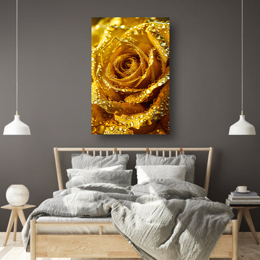 Gouden roos met fonkelende waterdruppels close-up canvas met baklijst