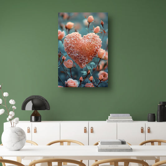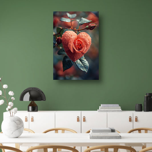 Rode roos in de vorm van een hart met dauwdruppels poster
