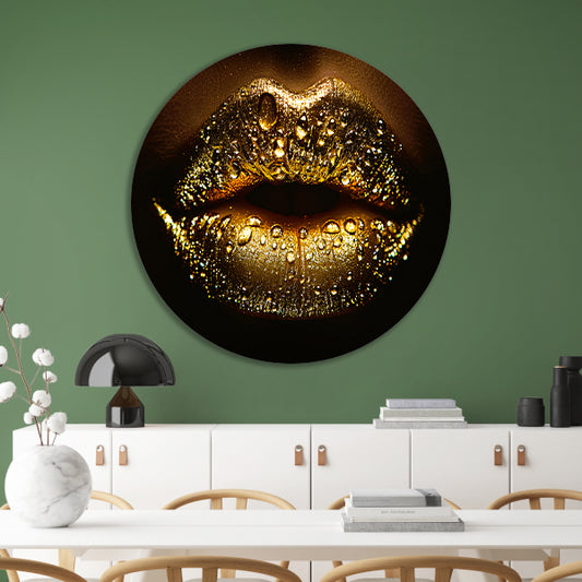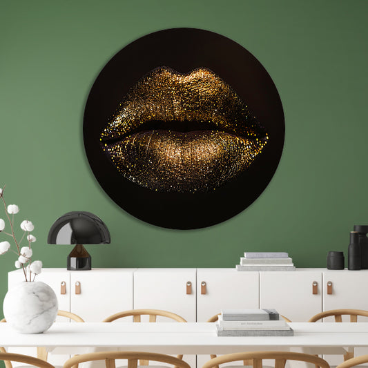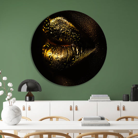 Gouden lippen in een oase van donker contrast aluminium muurcirkel