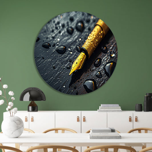 Elegante gouden pen op donkere achtergrond met waterdruppels aluminium muurcirkel