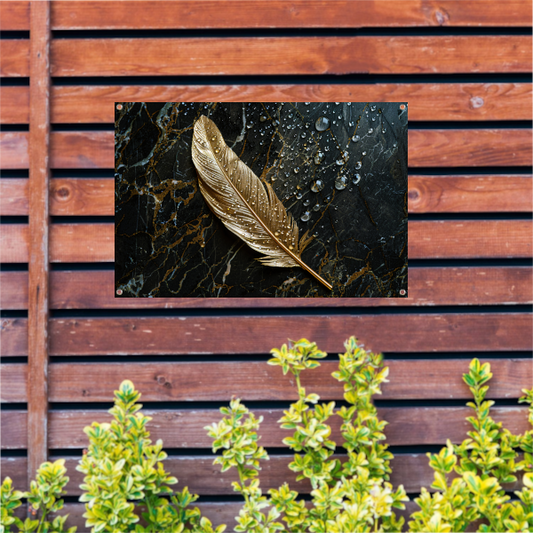 Gouden veer met waterdruppels op donker marmer tuinposter