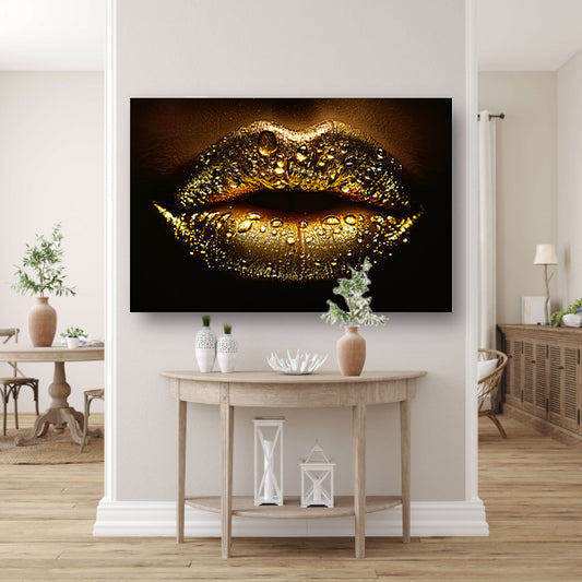 Gouden Glitters en Druppels op Donkere Lippen canvas met baklijst