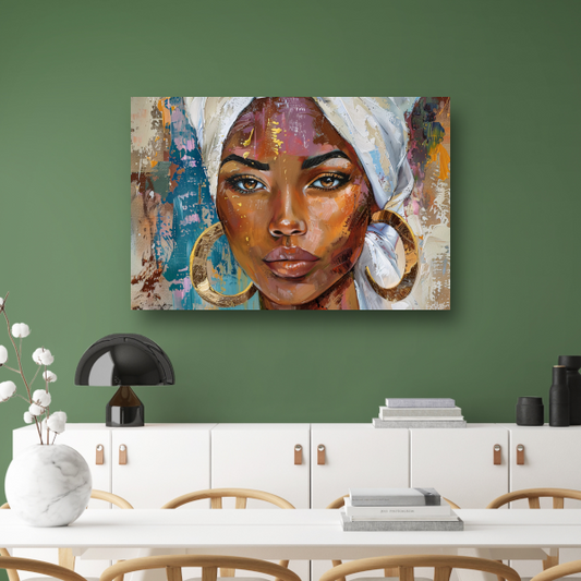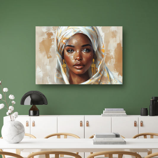 Afrikaanse vrouw met witte hoofddoek en gouden oorbellen canvas met baklijst