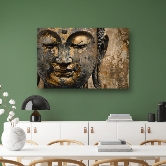 Gouden Boeddha portret op verweerde achtergrond canvas met baklijst