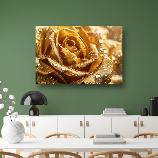 Gouden roos bedekt met glinsterende dauwdruppels canvas