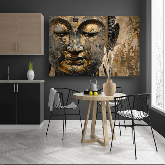 Vergulde Boeddha op verweerde achtergrond in gouden toetsen poster