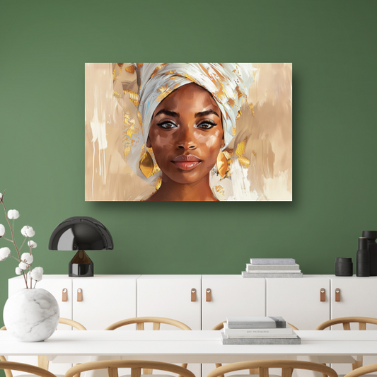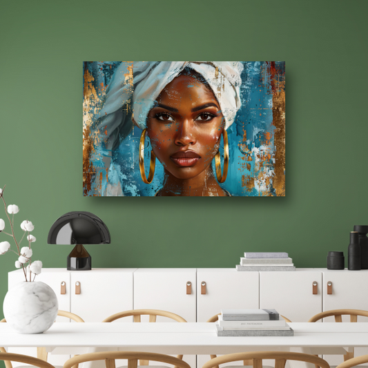Afrikaanse vrouw met witte hoofddoek en gouden oorbellen poster