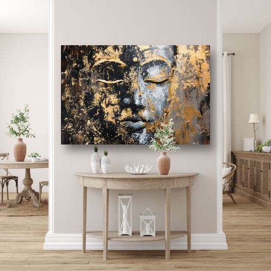 Boeddha portret met gouden en zwarte abstracte achtergrond acrylglas