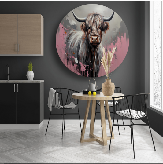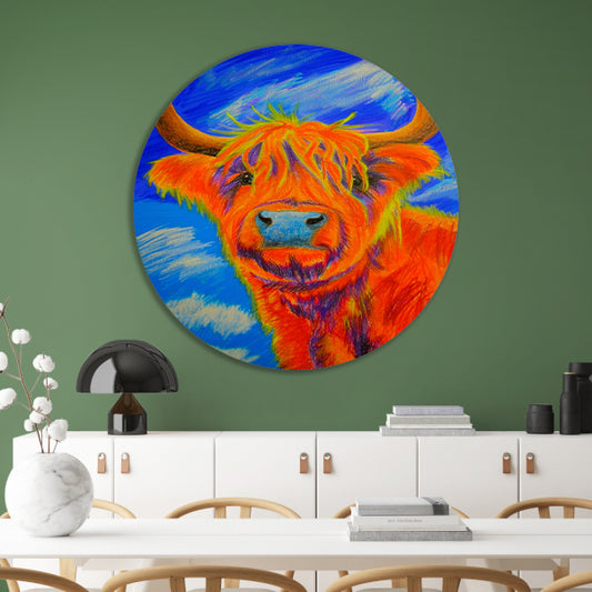 Levendige Highland Koe, Moderne Kunstinterpretatie aluminium muurcirkel