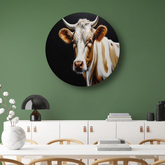 Koe met Vragende Blik op Zwarte Achtergrond aluminium muurcirkel