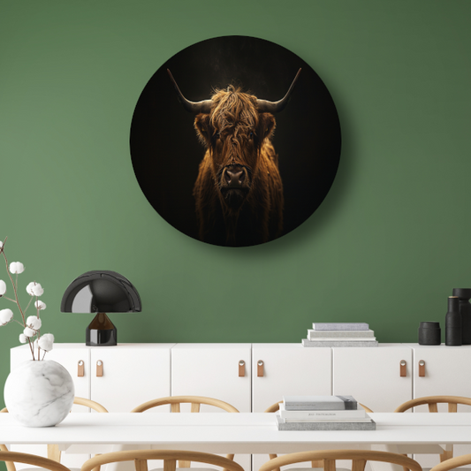 Schotse hooglander in duister lichtspel aluminium muurcirkel
