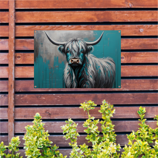Abstracte Turquoise Schotse Hooglander in Olieverf tuinposter