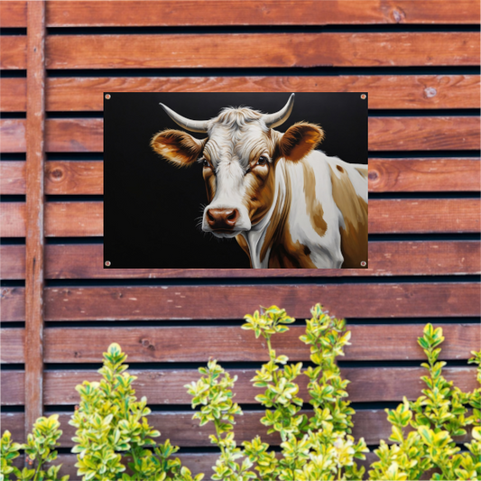 Koe met Vragende Blik op Zwarte Achtergrond tuinposter