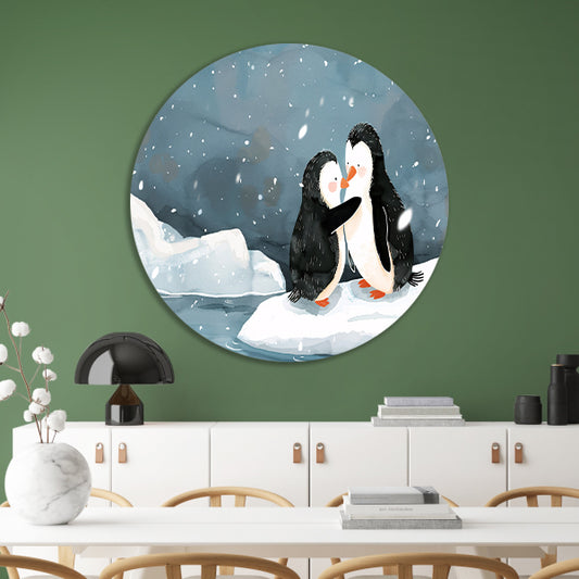 Knuffelende pinguïns in een winterse sneeuwbui forex muurcirkel