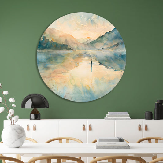 Vissersfiguur bij mistige bergmeer zonsopgang forex muurcirkel