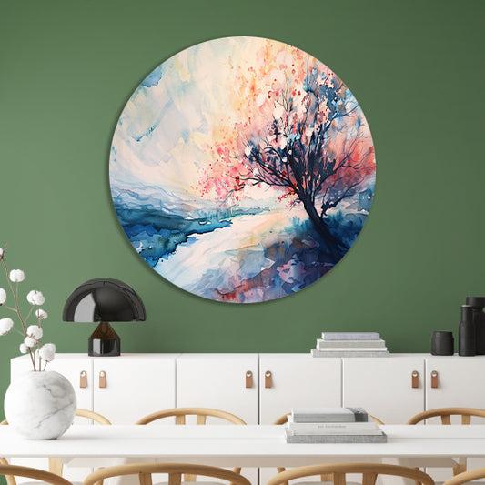 Bloeiende boom in serene aquarel landschapsweergave forex muurcirkel
