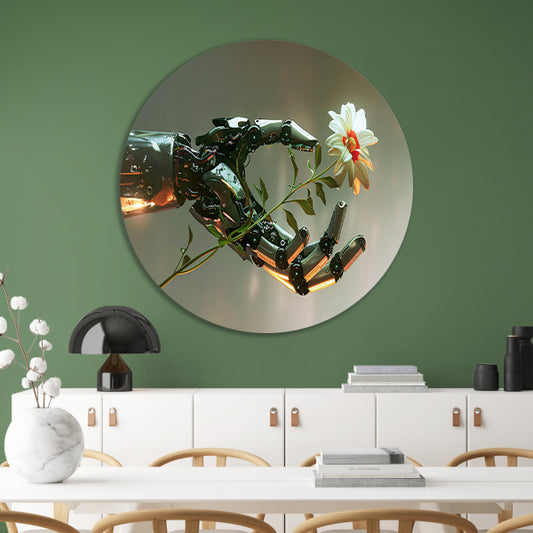 Hyperrealistische robotarm met bloem in contrast forex muurcirkel