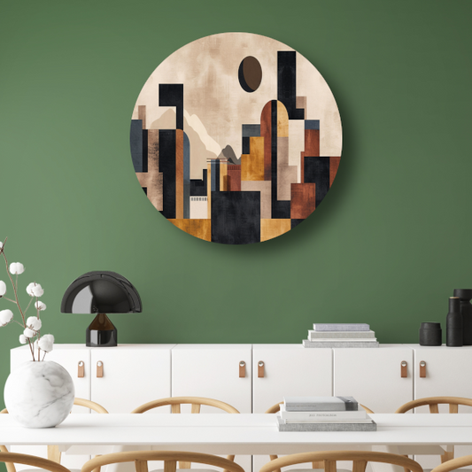 Kubistische interpretatie van stad en muziek aluminium muurcirkel