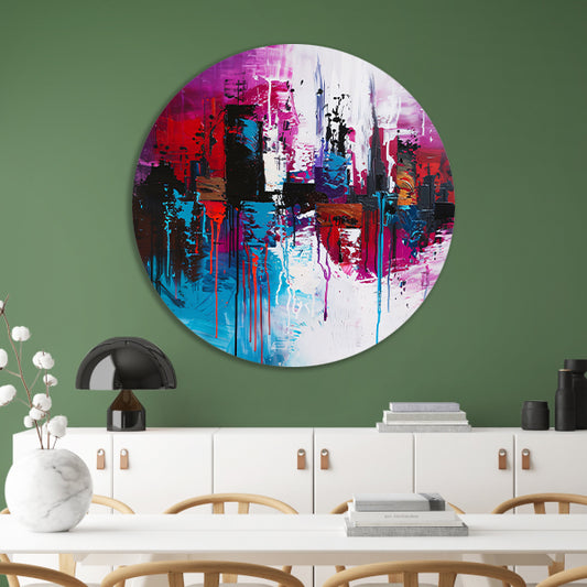Kleurrijke abstracte stad met dynamische verfspatten aluminium muurcirkel