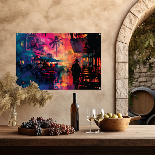 Levendige stedelijke zonsondergang in kleur tuinposter