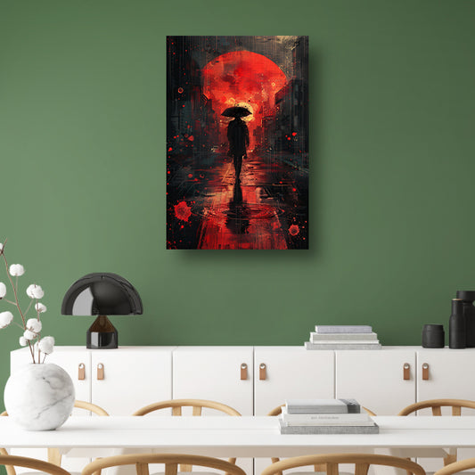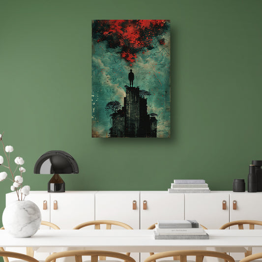 Eenzame Mens in Vervallen Stad met Rode Lucht poster