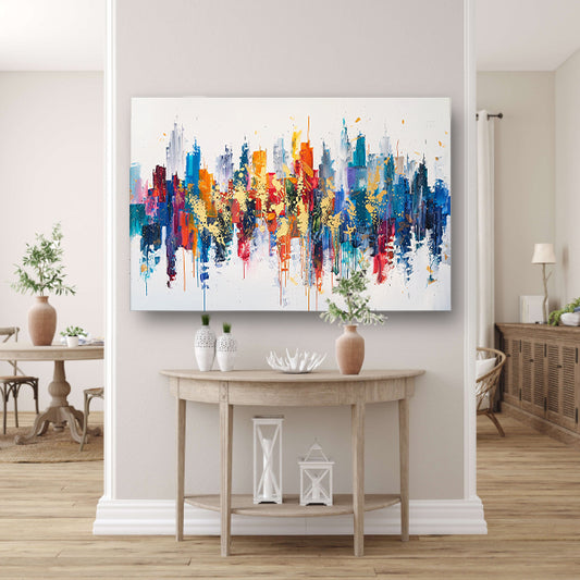 Kleurrijke abstracte stad met dynamische verfspatten poster