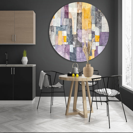 Abstract geometrisch schilderij met kleurblokken aluminium muurcirkel