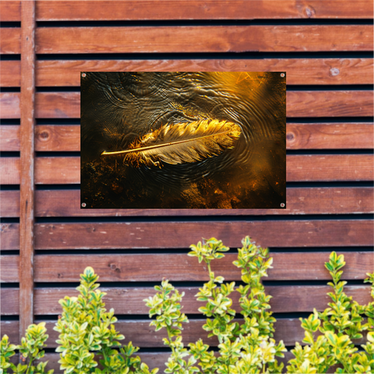 Gouden veer drijvend op een waterige zonsondergang tuinposter