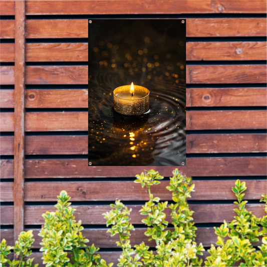 Sfeervolle kaars met gouden details op donker water tuinposter