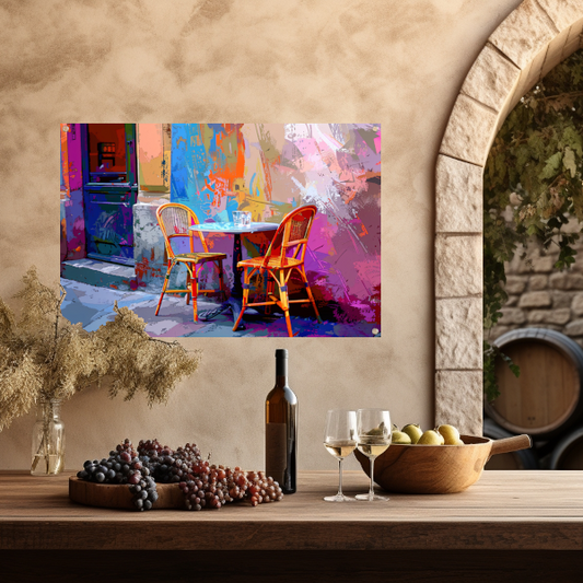 Versleten muur met klassieke bistrostoelen tuinposter