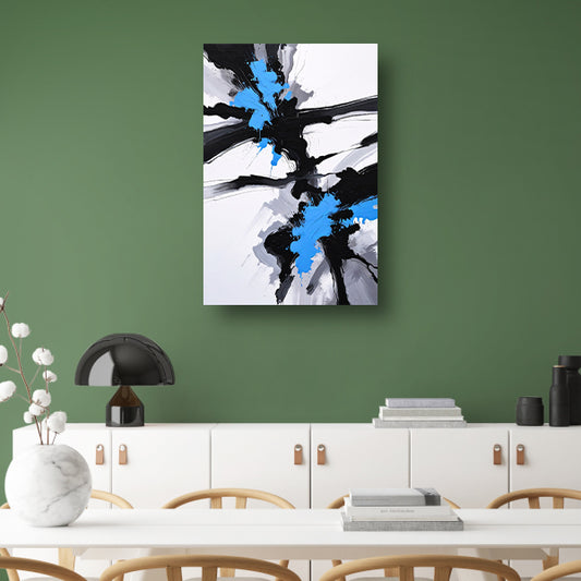 Energetische abstractie van blauw, zwart en wit canvas met baklijst