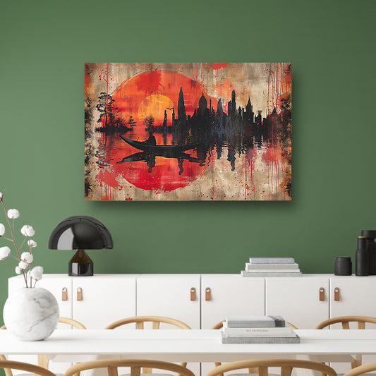 Roeiboot onder Rode Zonsondergang bij Stad poster