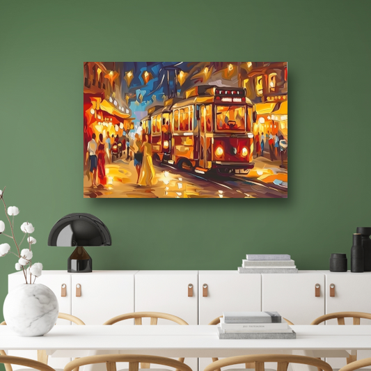 Levendige Stadstram in Kleurrijke Nacht canvas
