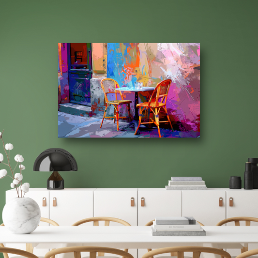 Versleten muur met klassieke bistrostoelen canvas