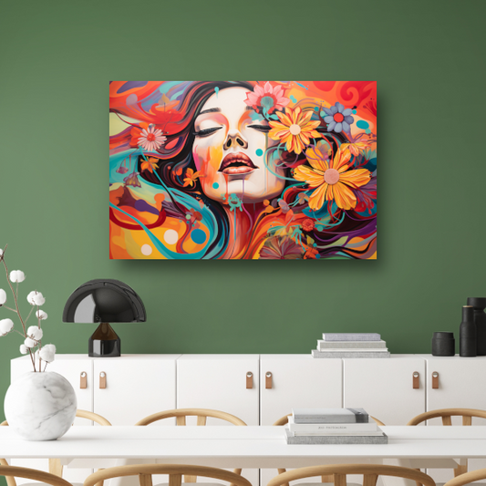 Slapende vrouw en kleurrijke bloemeneplosie canvas
