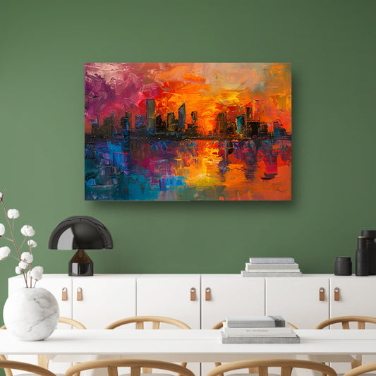 Kleurrijke abstracte skyline bij zonsondergang reflectie poster
