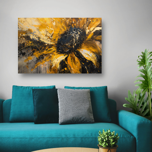 Dynamische abstracte zonnebloem in goud en zwart acrylglas
