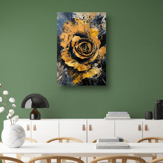 Dynamische abstracte roos in goud en zwart canvas met baklijst